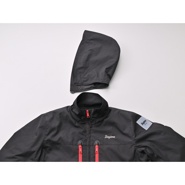 フードはファスナーで取り外し可能で、背面には夜間の視認性を高める反射プリント付き。