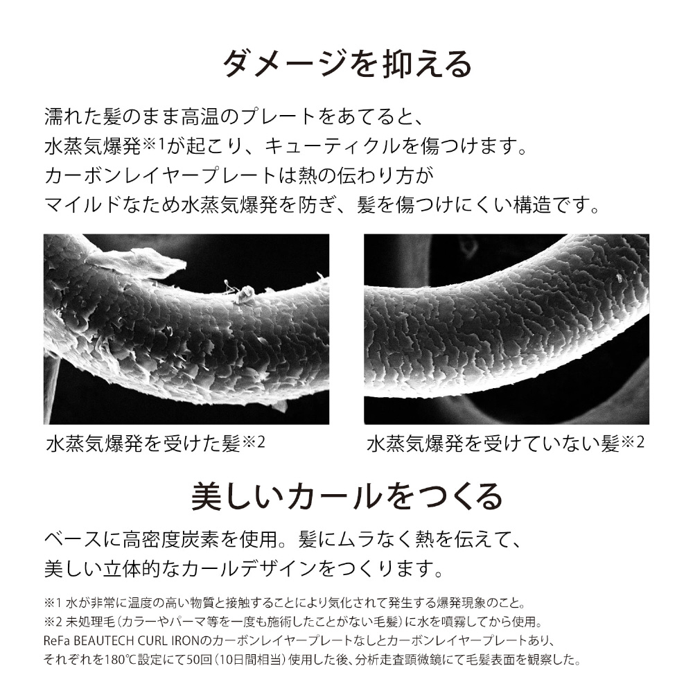 独自の技術「カーボンレイヤープレート」が、水・熱・圧をコントロールして美しい立体感がつづく”レア髪カール”を実現します。