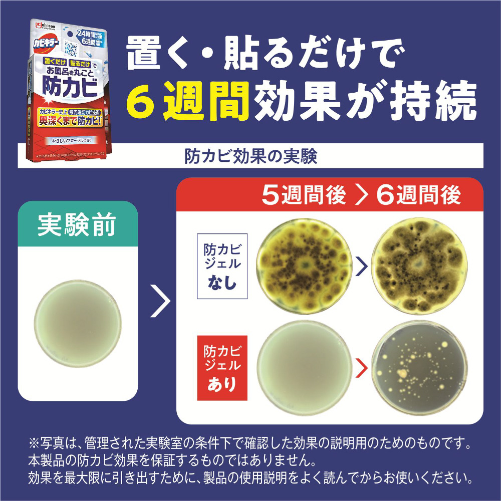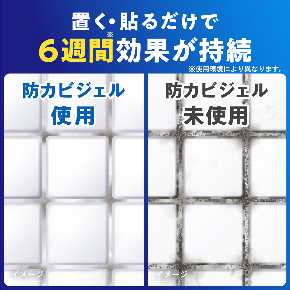 カビキラー史上最先端防カビ技術で奥深くまで防カビ※。防カビ効果の高いカラシナの種子から抽出したエッセンシャルオイルを選定。防カビ成分が24時間常に空気中に補充されるため、6週間しっかり効果が持続。置くだけ・貼るだけの簡単な使用方法(※タイル目地等の小さい穴(細孔)や狭い隙間に防カビ成分が入り込む)。