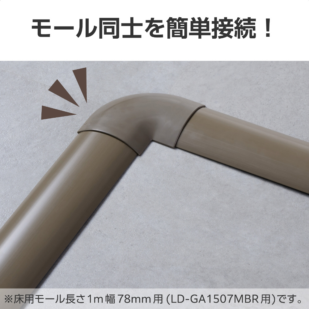 基台付きで、カバーはワゴンモールの蓋の上からかぶせるだけ。床配線の際のケーブルを保護し、すっきりと収納できる床用モール(LD-GA1507MBR)用のジョイントパーツ(曲ガリ)。