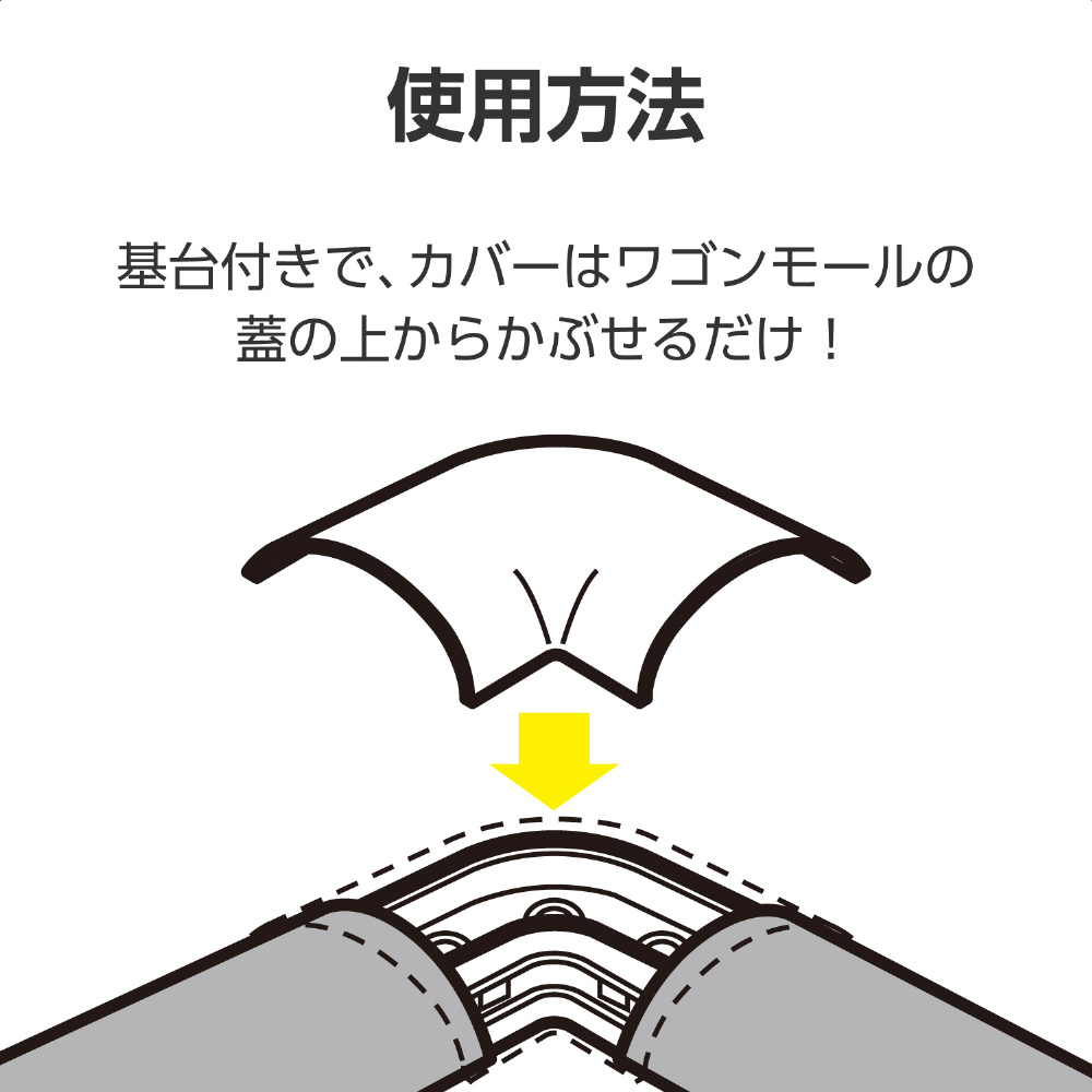 基台付きで、カバーはワゴンモールの蓋の上からかぶせるだけ。床配線の際のケーブルを保護し、すっきりと収納できる床用モール(LD-GA1507M)用のジョイントパーツ(曲ガリ)。