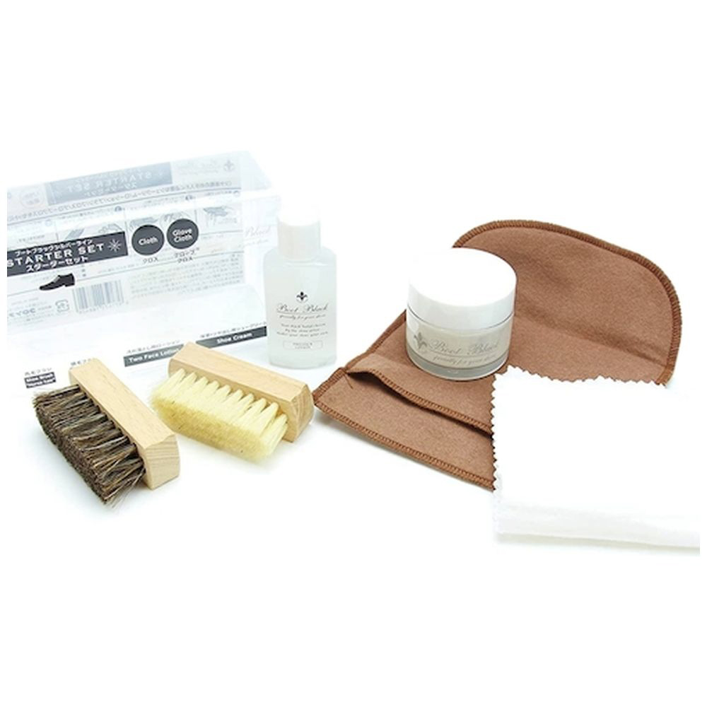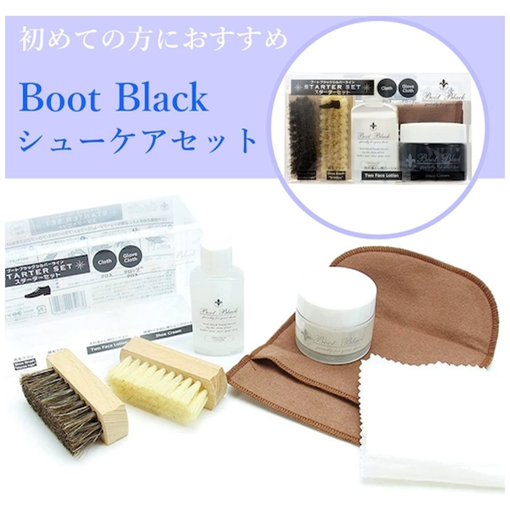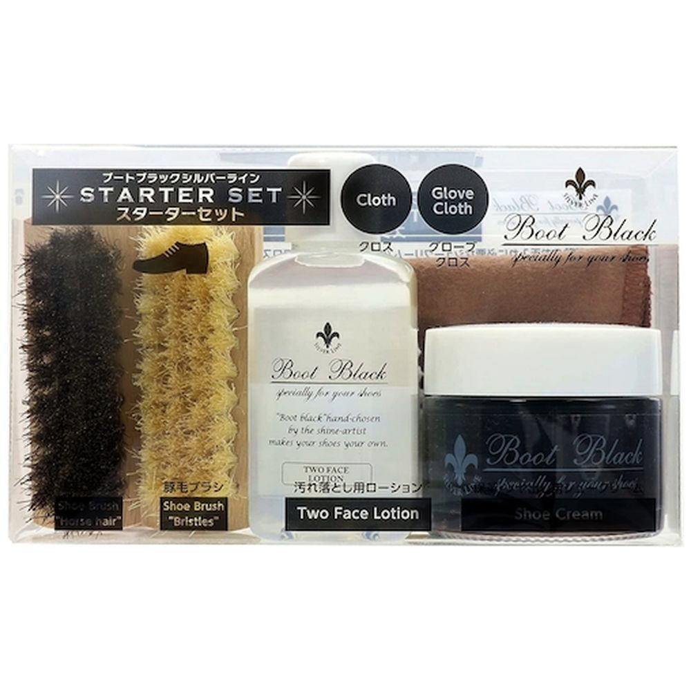 靴磨き初心者向け。シュークリーム、ローション、ブラシ、クロスがセットになった、ブートブラックシルバーラインのスターターセット。これ一つで本格的な靴磨きが可能です。