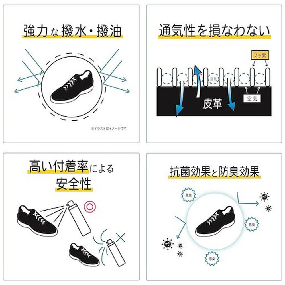 強力撥水&抗菌効果。靴やバッグ、傘など様々な素材に対応した防水スプレー。汚れを付きにくくし、ニオイも抑制します。