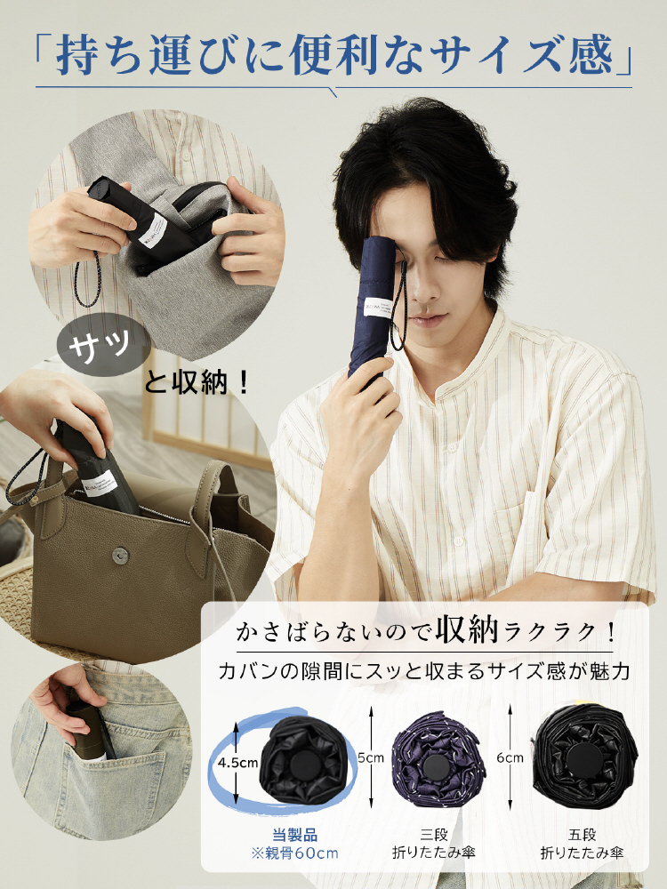 直径89cm?108cmという十分な大きさでありながら、重さはわずか89g?139g。また、折りたたんだ時の長さは約21cm?24cm、直径は約3.5cm?4.5cmです。持ち運びの負担を感じさせません!カバンに入れて携帯できるスリムサイズで急な雨に降られても安心です。