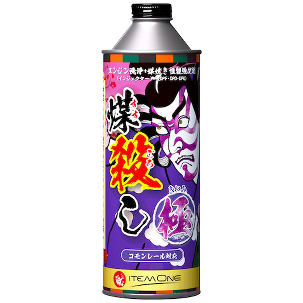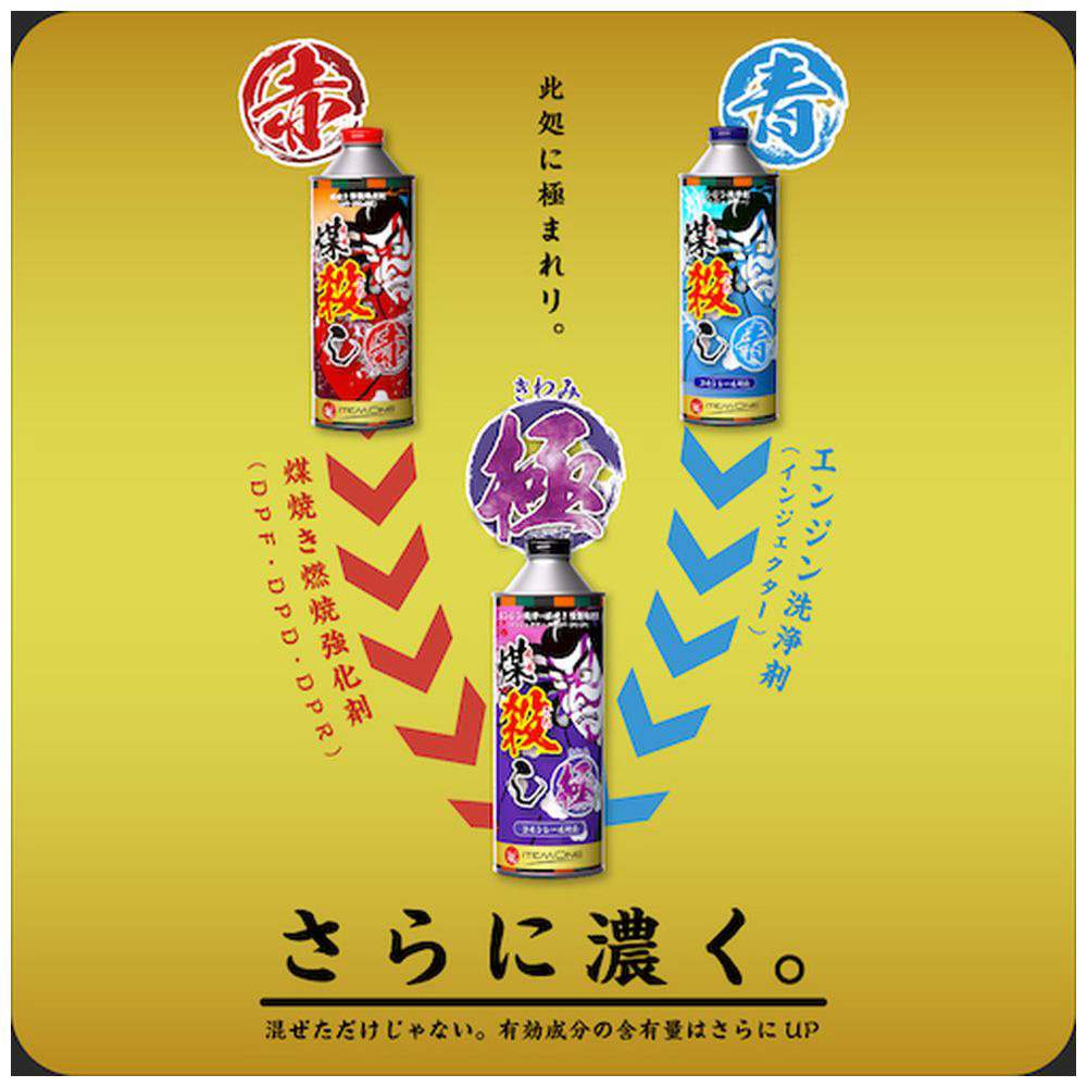 「煤殺し 極」は「煤殺し 赤」と「煤殺し 青」両方の成分を併せ持ち、なおかつ着火性を向上させ、不完全燃焼を防ぎ、煤の発生量を抑えることができる「セタン化向上剤」とオイルや燃料系統で問題となる汚れそのものを溶解・分散させ、エンジン内部の汚れを徹底的に除去させる「清浄分散剤」を配合。