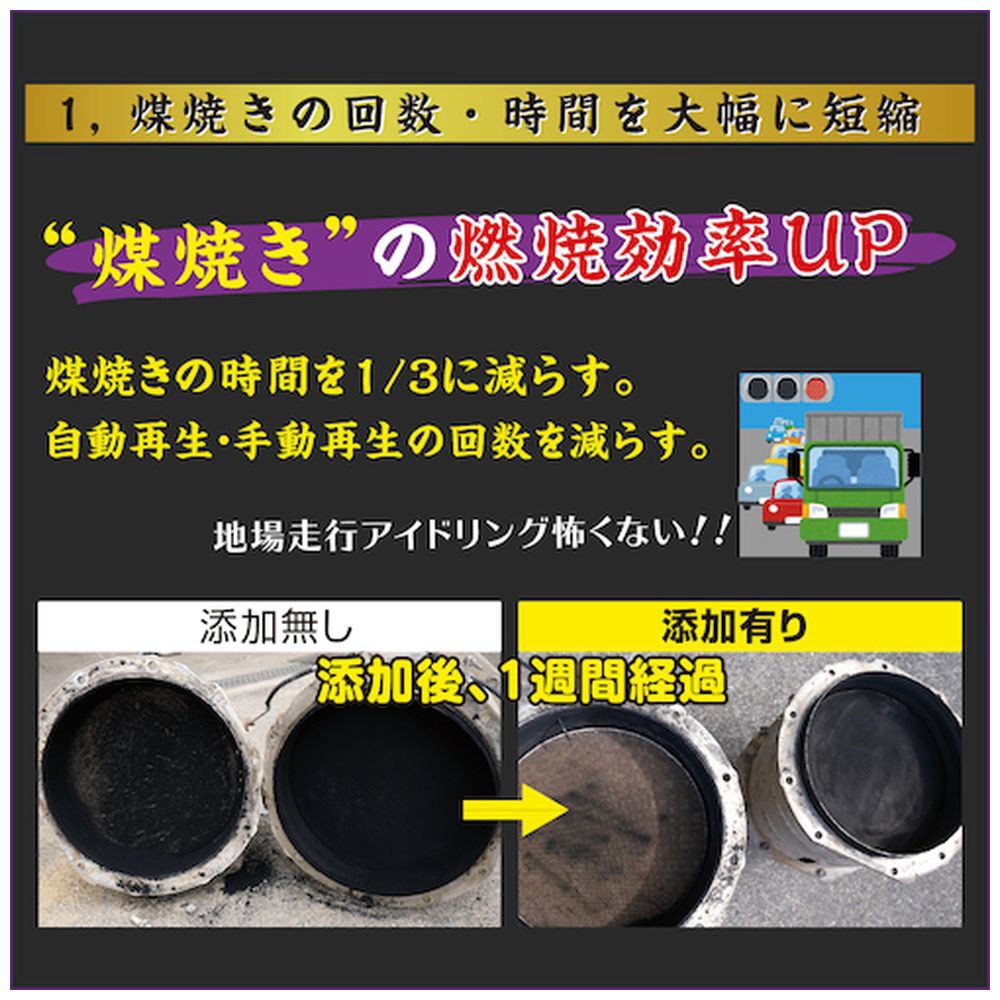 ■「煤殺し 極」は「煤殺し 赤」と「煤殺し 青」両方の成分を併せ持ち、なおかつ着火性を向上させ、不完全燃焼を防ぎ、煤の発生量を抑えることができる「セタン化向上剤」とオイルや燃料系統で問題となる汚れそのものを溶解・分散させ、エンジン内部の汚れを徹底的に除去させる「清浄分散剤」を配合。