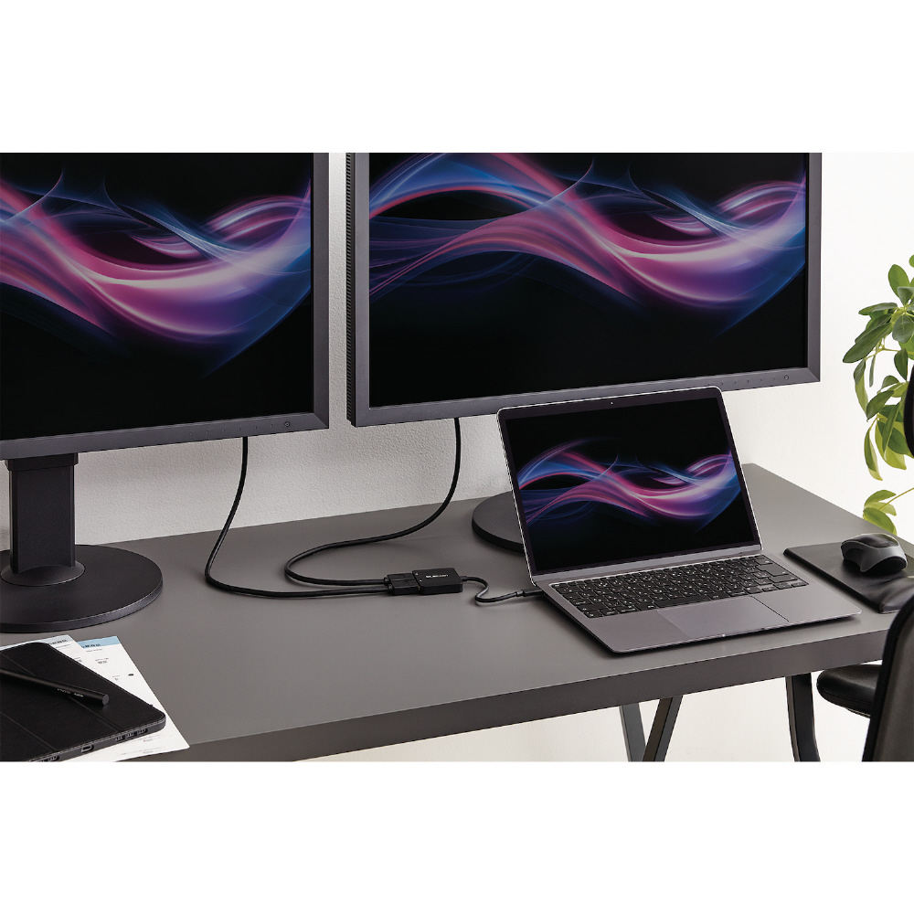 DisplayPortコネクター搭載のディスプレイなどに映像を出力できる変換アダプターです。USB Type-Cポート搭載パソコンなどの映像信号を、DisplayPortコネクター搭載ディスプレイなどに最大2台まで映像を出力することができ、画面複製と画面拡張に対応しています。