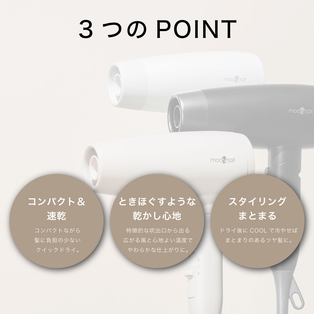 根元からポイントで乾かすことに特化した従来モデルから、特徴的な吹出口から出るバランスの取れた広がる風で、髪を心地よく乾かすことが可能に。
