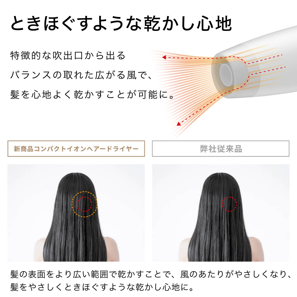 髪の表面をより広い範囲で乾かすことで、風のあたりがやさしくなり、髪をやさしくときほぐすような乾かし心地に。