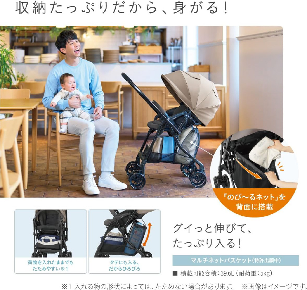 ●持ちカルグリップ:脇に抱えて、片手でラクに持ち運べるグリップを搭載。ベビーカーがグラつかずに安定して持つことができます。