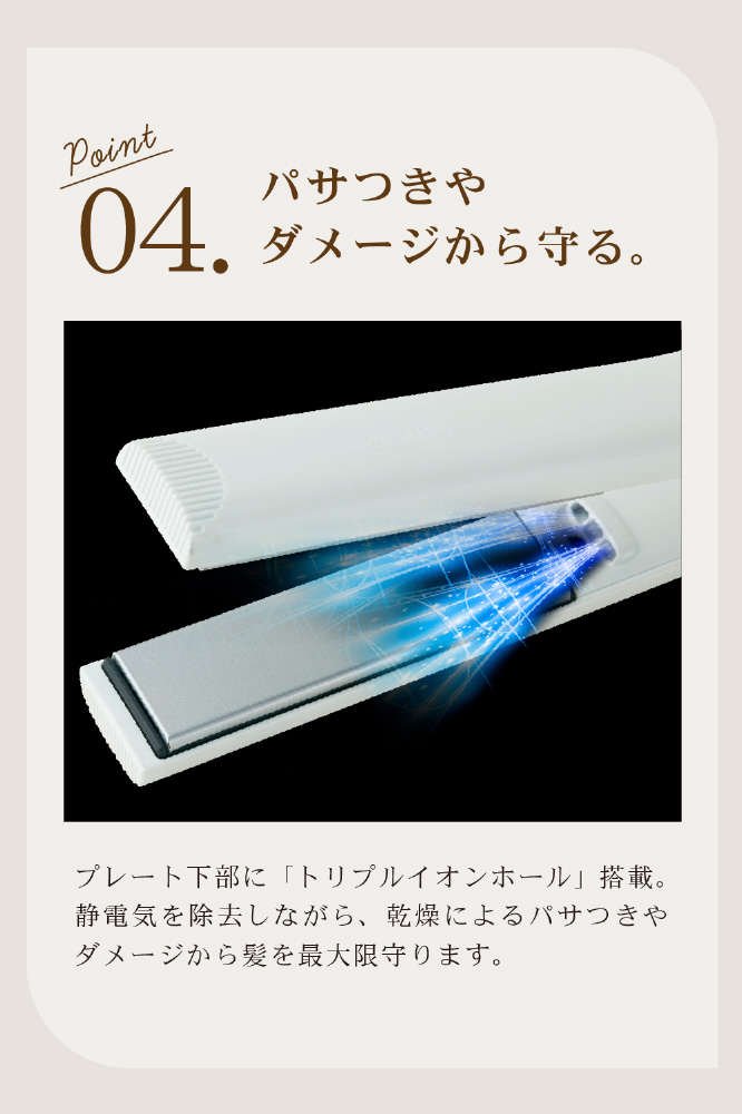 プレート下部にイオンホールを搭載することでまとまりのある艶やかな髪に導きます。