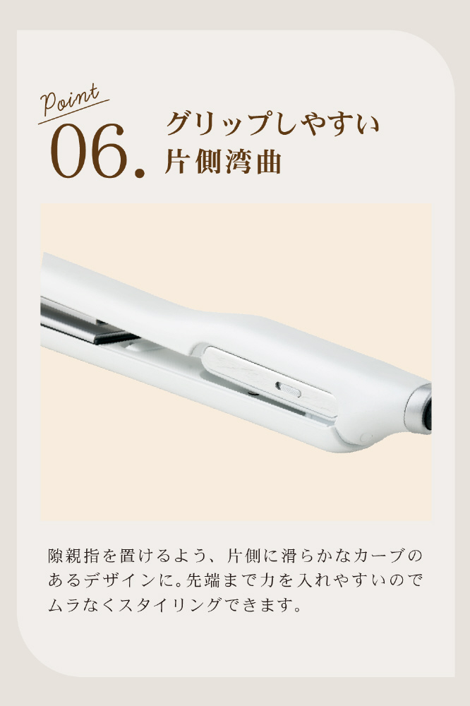 誰でも簡単に前髪や顔まわりのニュアンスかールがつけやすい仕様。また、100mm×28mmとプレートを大きく設計することで、ロングの方でも一度に髪の毛を絡みやすいプレートの仕様となりました。