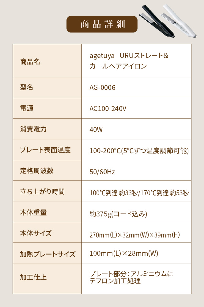 URUストレートヘアアイロン ブラック AG-0006-BK [交流(コード)式]