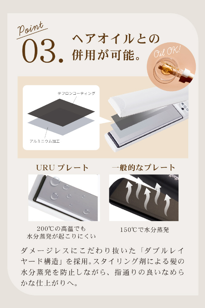 ■熱による髪の水分蒸発を防ぐ「URUプレート」搭載。200℃状態のプレートに水をかけてもすぐには蒸発しません。