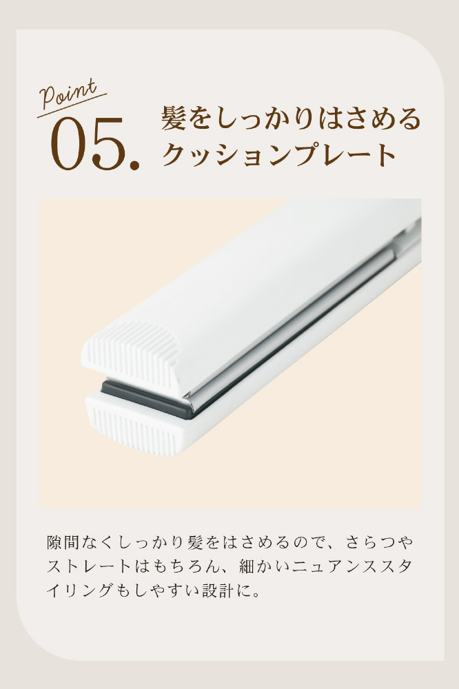 プレート下部にイオンホールを搭載することでまとまりのある艶やかな髪に導きます。
