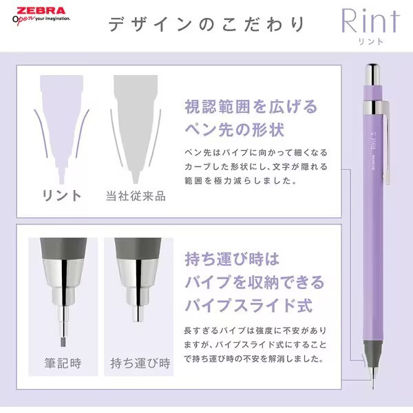 そこでゼブラは、書いている文字の見えやすさは「美しい書き姿」に繋がるのではという点に着目し、先端のパイプを2倍以上長くする「リントシステム」を搭載したシャープペン「リント」を開発しました。