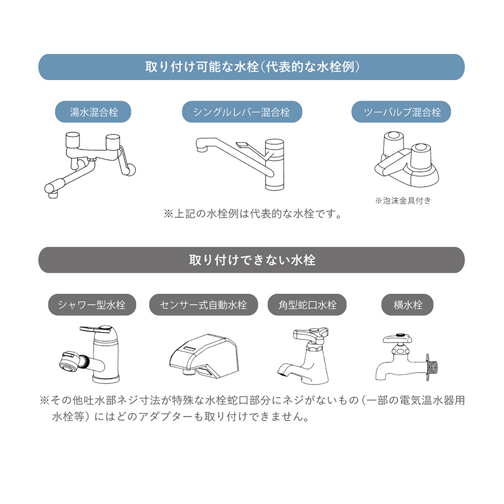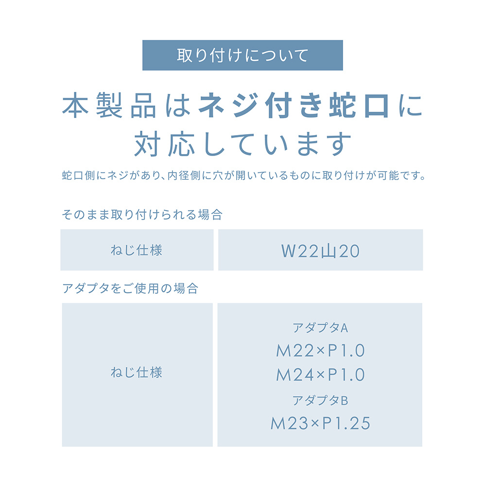 ※その他吐水部ネジ寸法が特殊な水栓蛇口部分にネジがないもの(一部の電気温水器用水栓等)にはどのアダプターも取り付けできません。