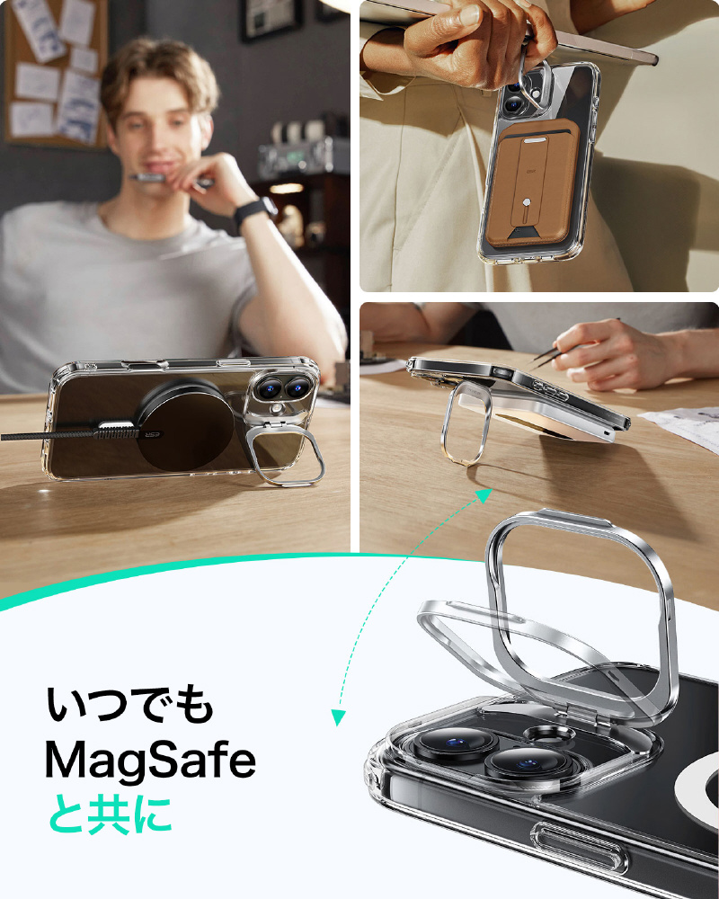 折りたたんだときにカメラのフレームに隠れるように配置され、MagSafeリングを100%妨げず、いつでもどこでも自由に調整でき、安定した角度で動画を視聴できます。