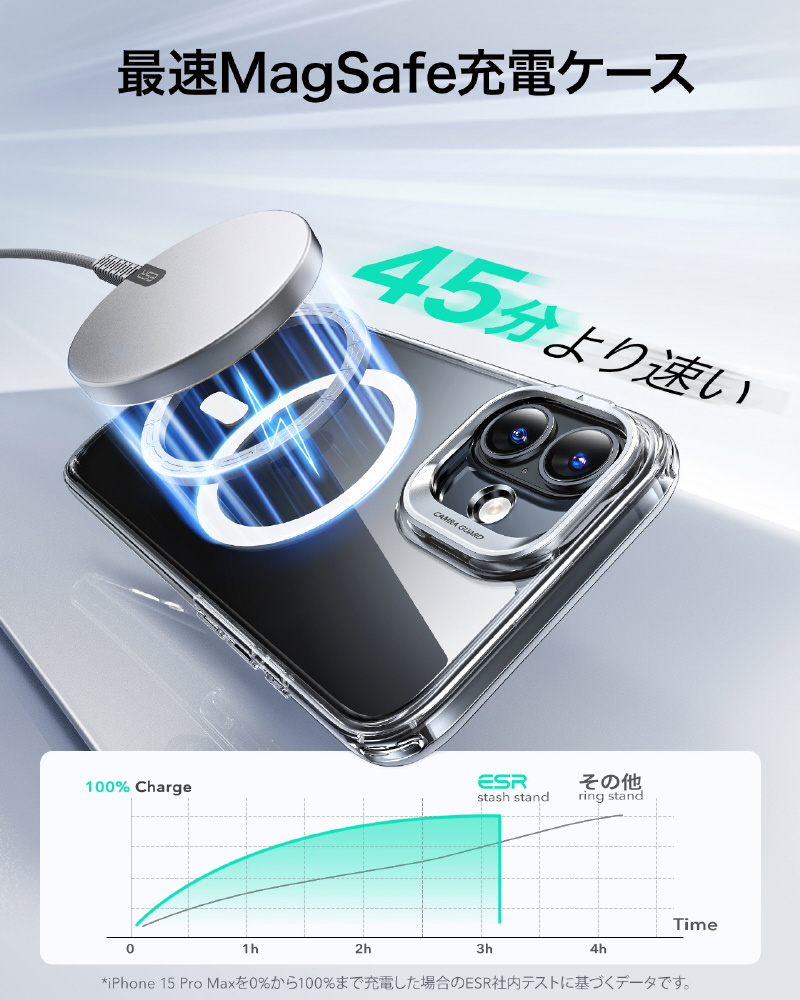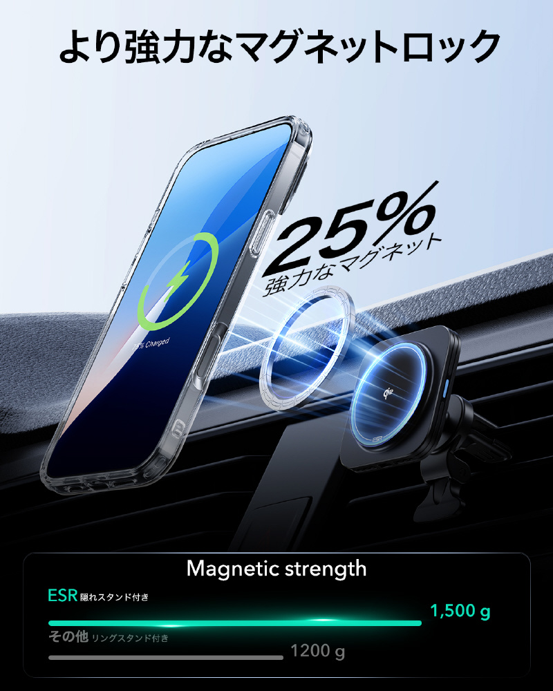 1,500 gの吸着力を持つ強力な内蔵磁石により、素早く簡単にワンタッチでワイヤレス充電が可能で、MagSafeアクセサリーを確実に吸着します。