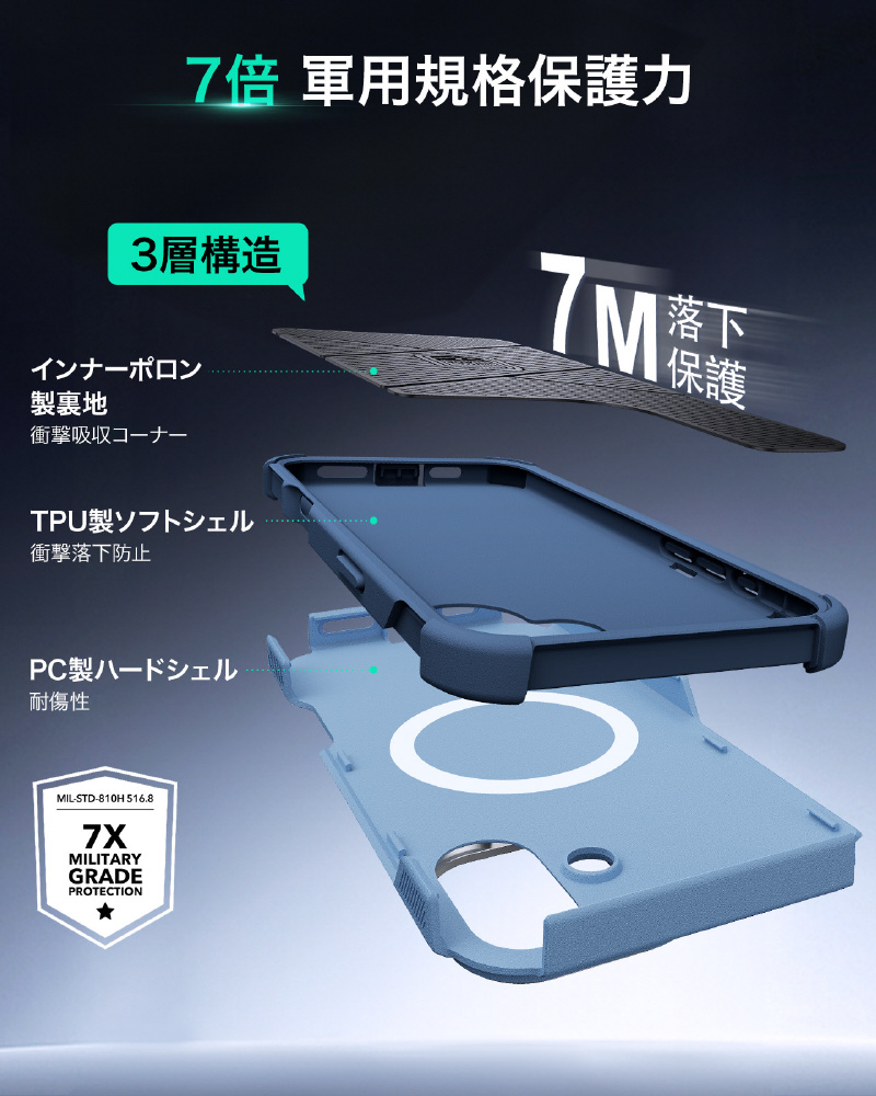 硬いTPEとPCのアウター部による3層構造は外側の衝撃や傷から保護し、クッション性の高いソフトなインナー部は内側の衝撃吸収を行い、最大約 7メートルの高さからの落下からもスマホを守ります。
