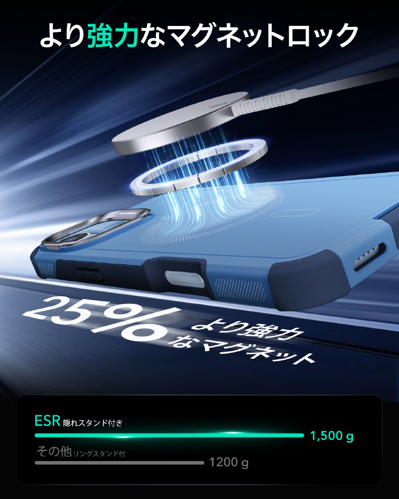 1,500gの保持力を持つ強力な内蔵マグネットが、より速く、より簡単な瞬間吸着ワイヤレス充電と、あらゆるMagSafeアクセサリーへの安全な磁気吸着固定を可能にします。