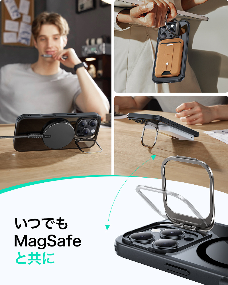 折りたたんだときにカメラのフレームに隠れるように配置され、MagSafeリングを100%妨げず、いつでもどこでも自由に調整でき、安定した角度で動画を視聴できます。