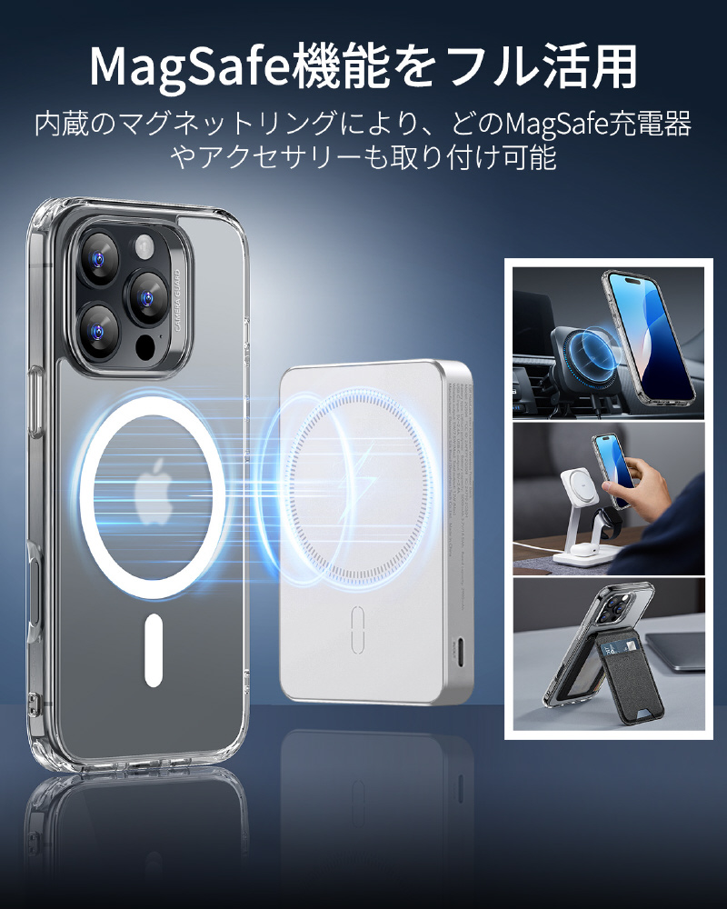 1,500gの保持力を持つ強力な内蔵マグネットは、より速く、より簡単な瞬間吸着ワイヤレス充電を可能にし、あらゆるMagSafeアクセサリーに安全なロックを提供します。