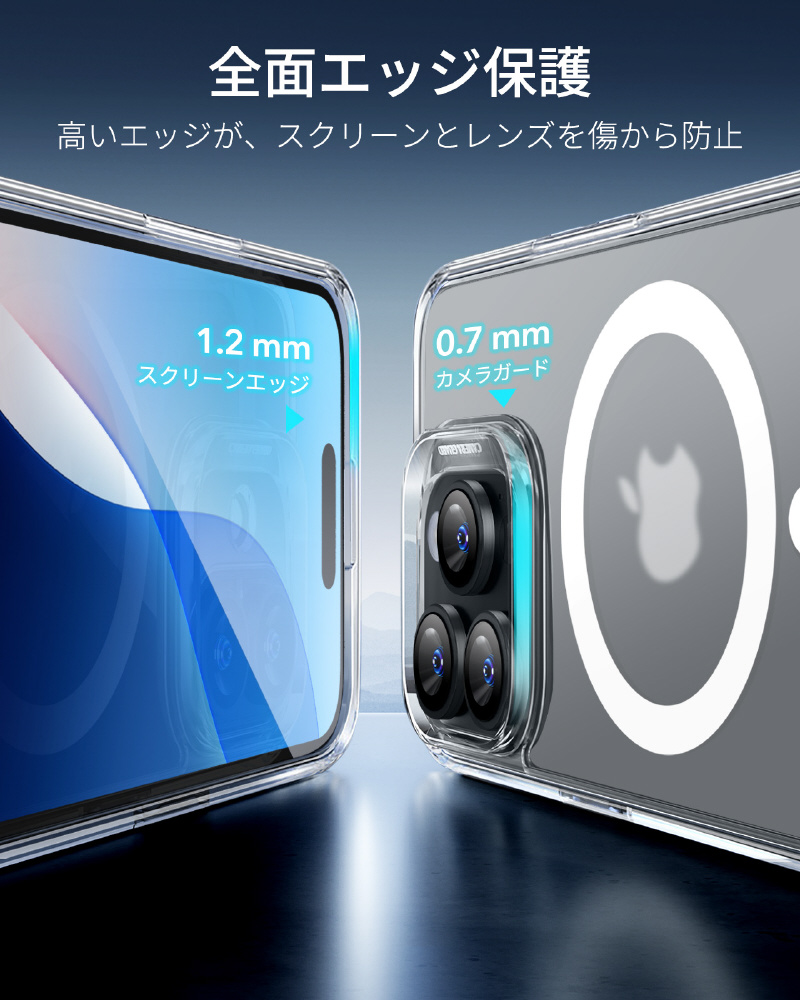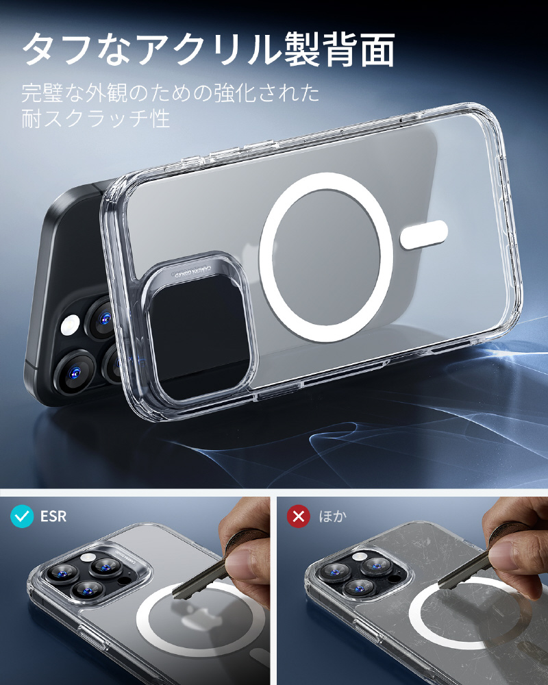 傷がつきにくく、透明度の高いアクリル製の背面により、iPhone 16 Proのオリジナルで洗練された本来の外観をキープします。