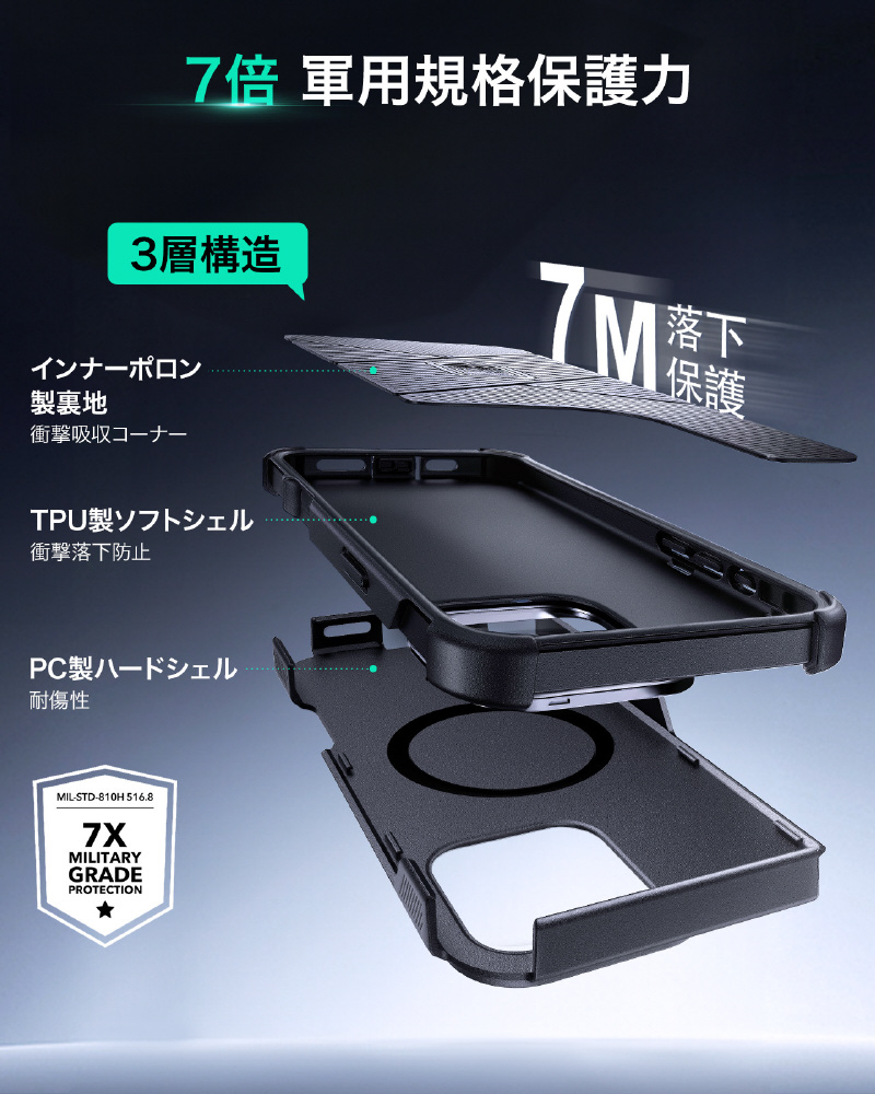 硬いTPEとPCのアウター部による3層構造は外側の衝撃や傷から保護し、クッション性の高いソフトなインナー部は内側の衝撃吸収を行い、最大約 7メートルの高さからの落下からもスマホを守ります。