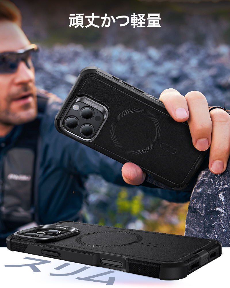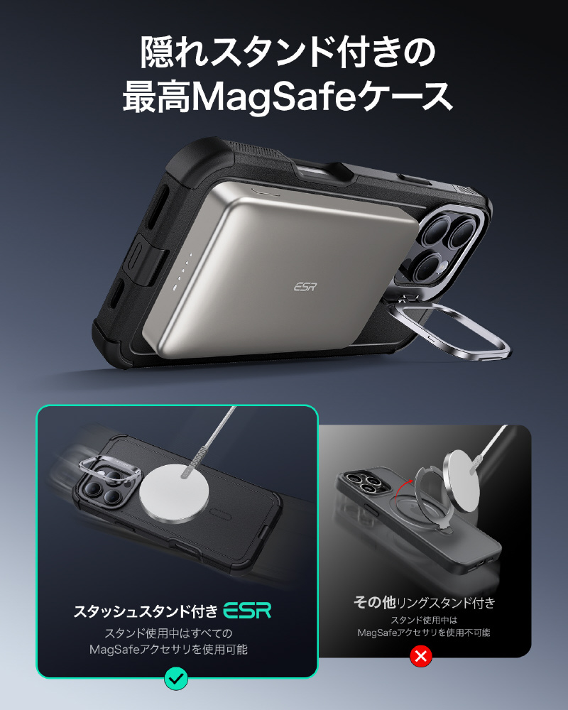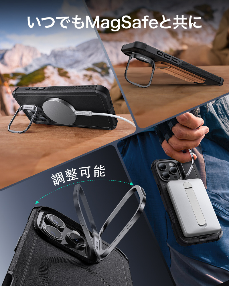iPhone 16 Pro Max(6.9インチ) ミリタリーグレードスタンド付ハイブリッドケース ESR Black CyberToughCasewithStashStandiPhone16ProMax