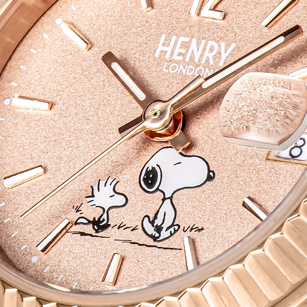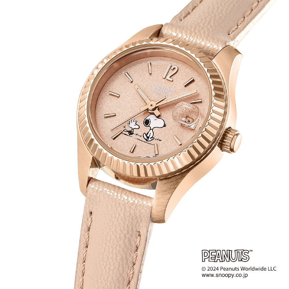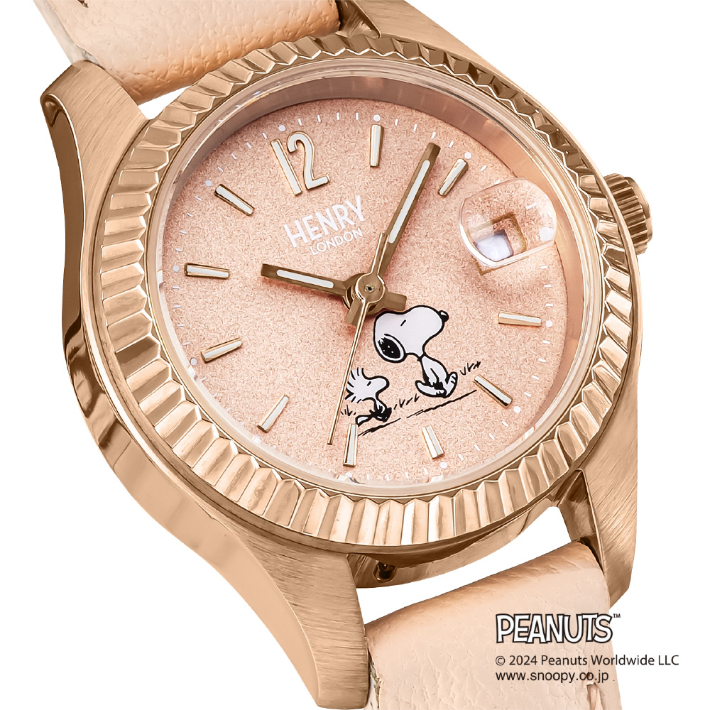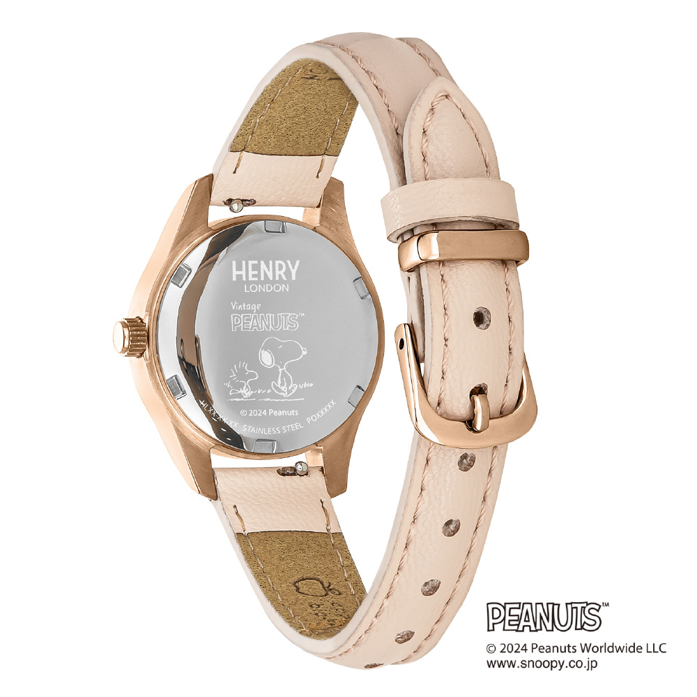 ■ヘンリーロンドンの特徴の一つでもある様々なカラーリングの文字盤上にスヌーピーが可愛らしく登場します。裏蓋のスヌーピーもポイント。