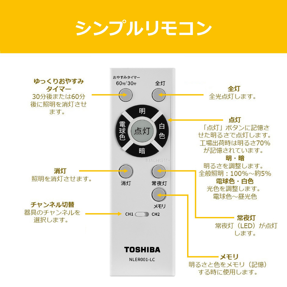 明るさをリモコンで自在に調整(全灯時:100%〜約5%)できる調光機能を備えています。