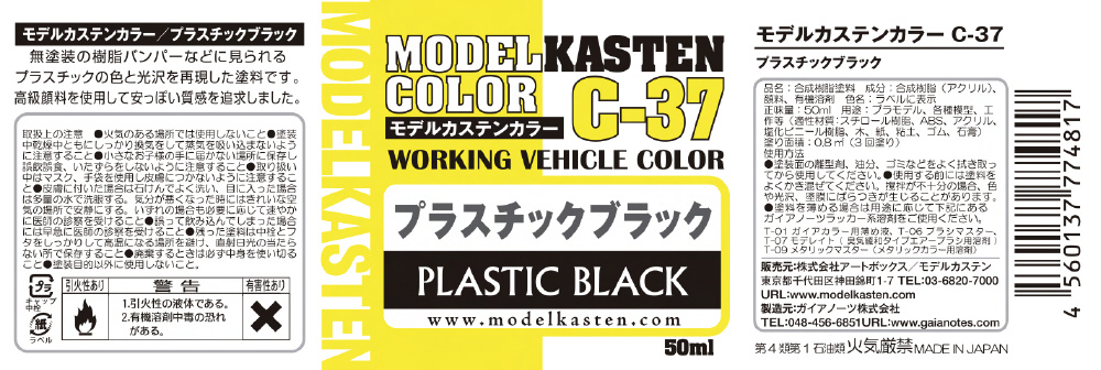 プラスチックブラックは、車などの無塗装の樹脂バンパー、ダッシュボードにみられる独特の素材感とツヤを再現した塗料です。