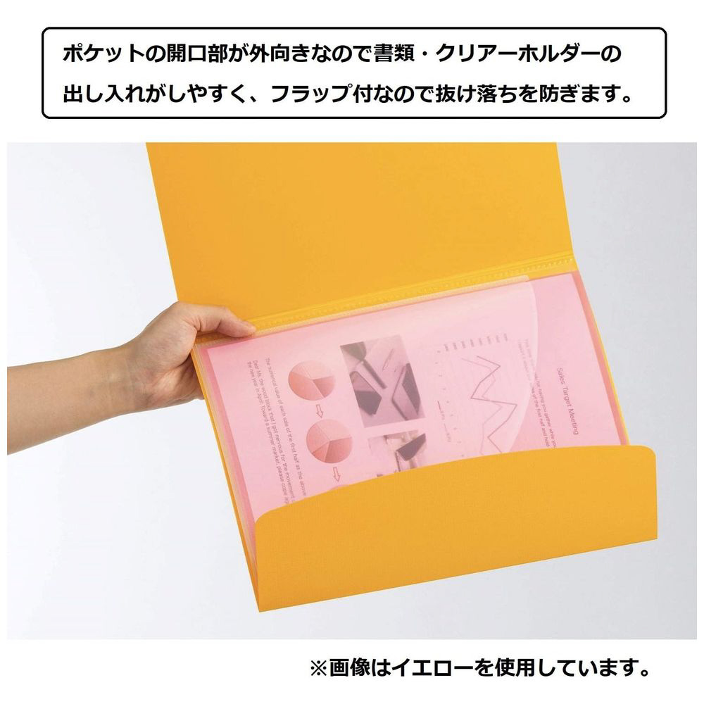 ポケットの開口部が外向きなので書類・クリアーホルダーの出し入れがしやすく、フラップ付なので抜け落ちを防ぎます。