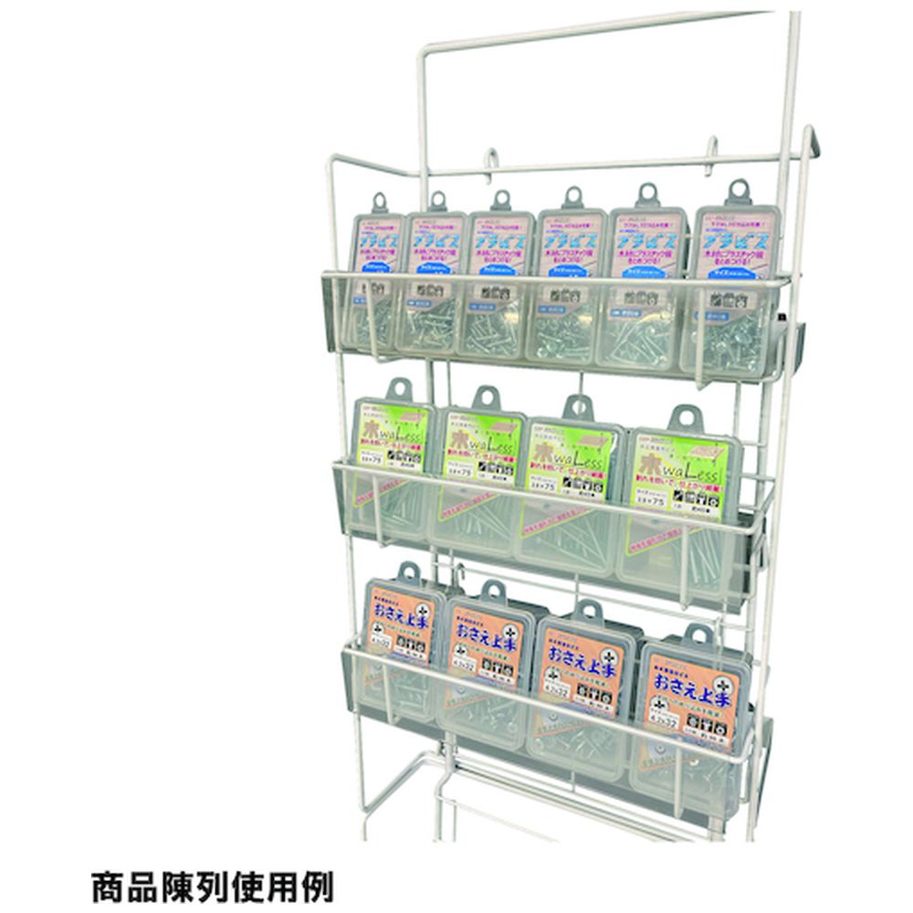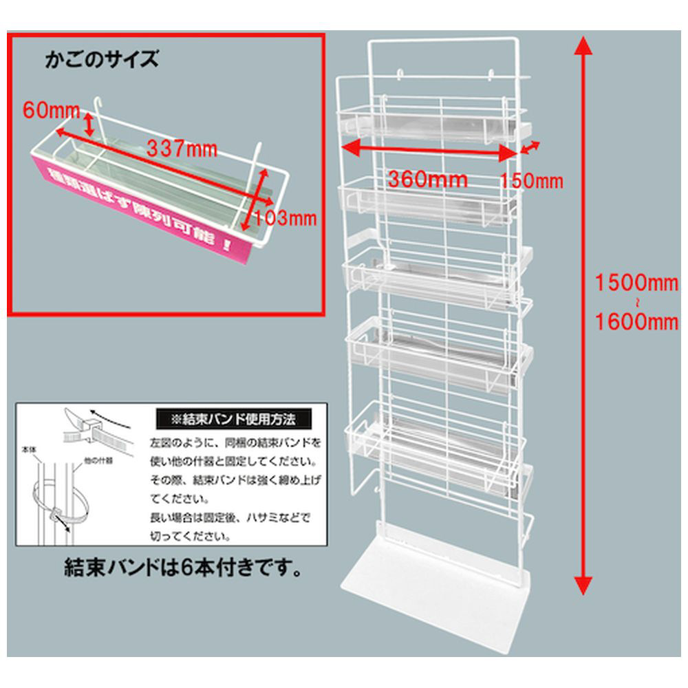 結束バンドで他の什器と固定して設置し、陳列商品総重量は6kg未満に抑えてください。