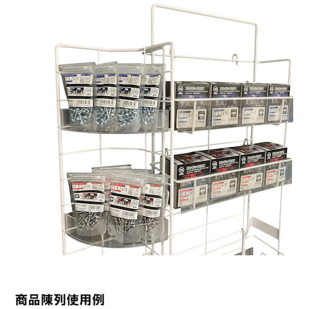 エンドサイドなどの什器に固定して使用でき、トレイにはPOPを差し込んで訴求効果を高めることができます。
