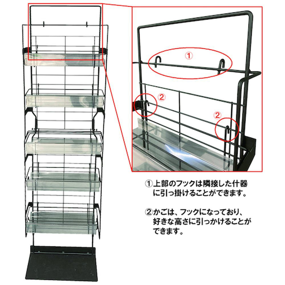 ネットカゴ5個付きで、商品陳列とPOP差し込みによる訴求効果が期待できます。