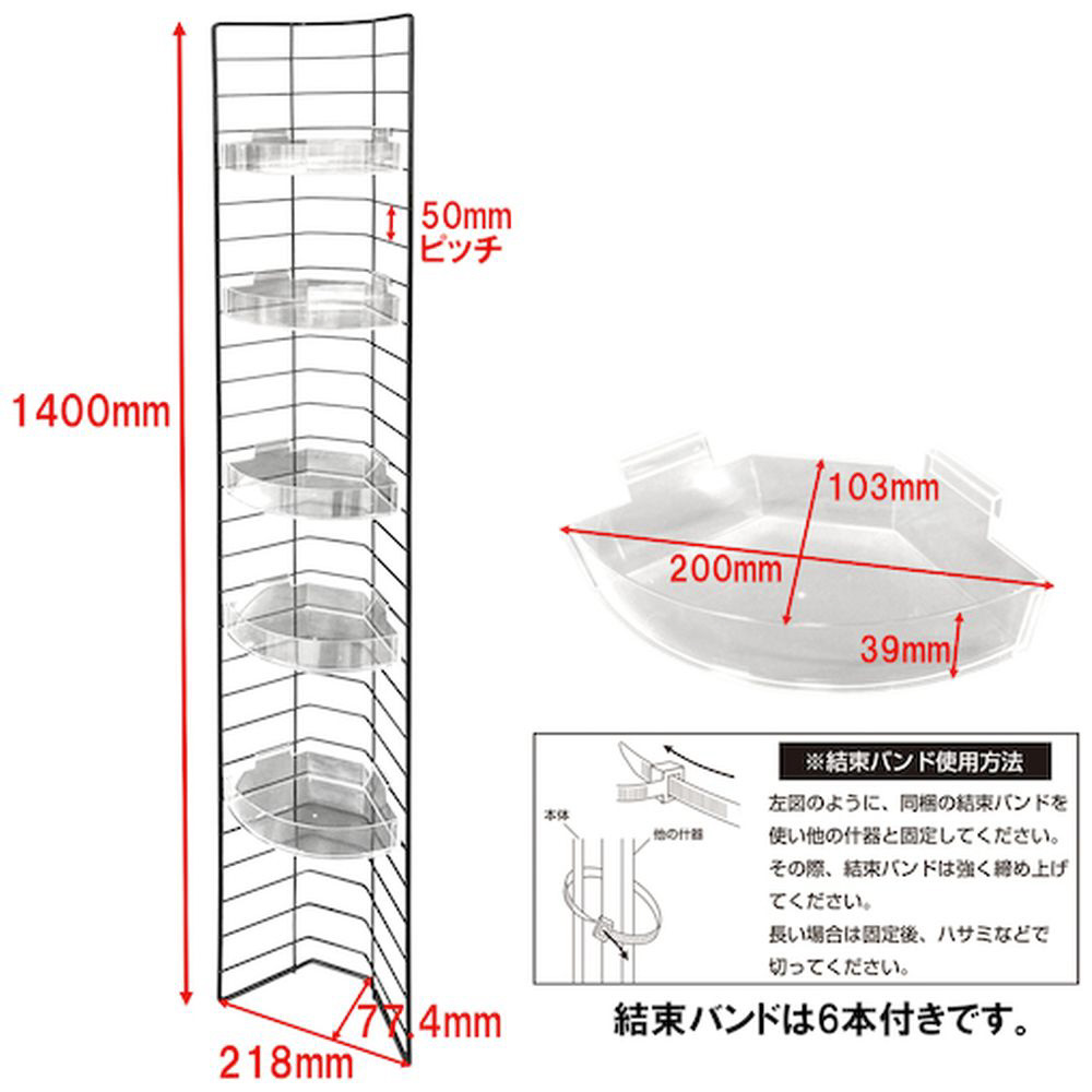 POP差し込み可能なトレイ付きの5段サイドネット什器。エンドサイド什器などに固定して使用でき、商品の訴求効果を高めます。