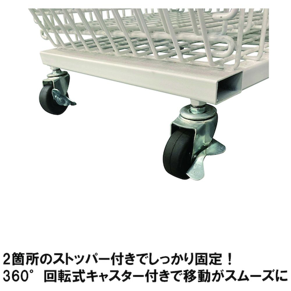 大容量で重量物の陳列にも対応し、360°回転式キャスター付きで移動がスムーズです(2個はストッパー付き)