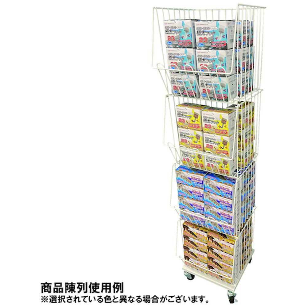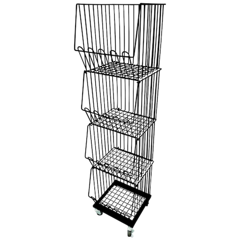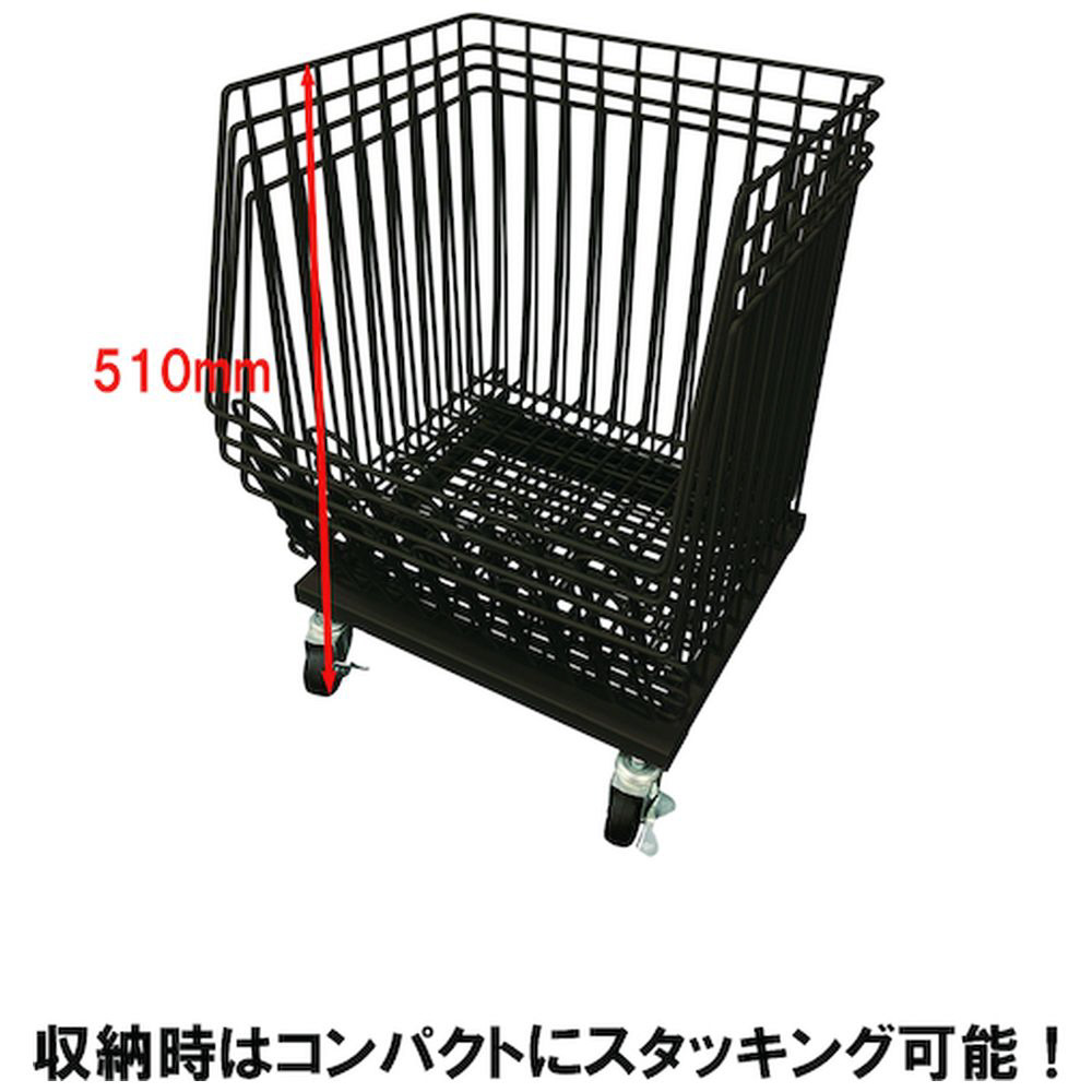 スタッキング式で収納も簡単なジャンブル什器。大容量で重量物にも対応、キャスター付きで移動もスムーズです。