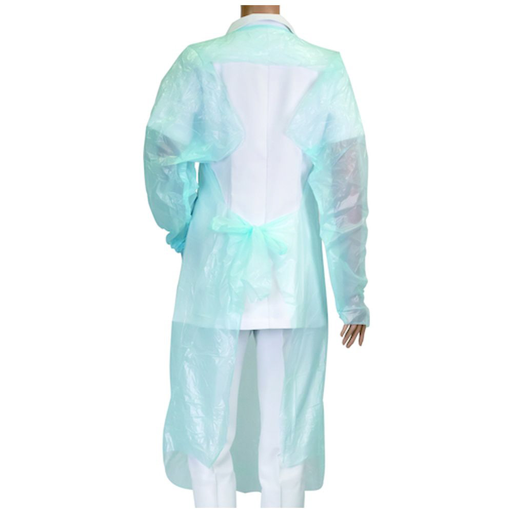 防水・長袖の使い捨てプラスチックエプロン。医療現場から清掃、食品加工まで幅広く対応。フィンガーフック付きで着脱簡単。