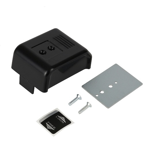 ハンドルカバー(プラスチック)、補強板(鉄板)、ネジ×2、シールのセット。