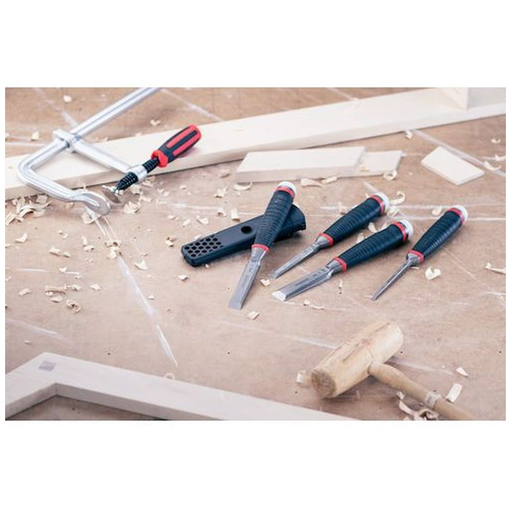 ハルタホースのストライキングチゼル4本セットです。6mm、12mm、18mm、25mmと使用頻度の高いサイズが揃っており、先端の25°角度により対象と平行に作業できます。一体型鍛造で強靭、耐久性と切れ味を両立。滑りにくいグリップと衝撃軽減機能付きで、打撃用キャップは工具不要で交換可能。ベルト装着可能なケース入りで実用性も抜群です。