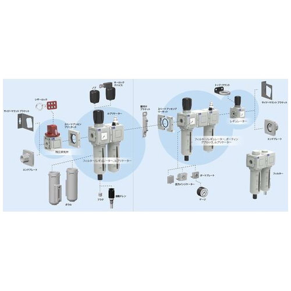 残圧排気弁、フィルター/レギュレーターを予め組み合わせたシステムです。ユニット化した省スペース設計です。