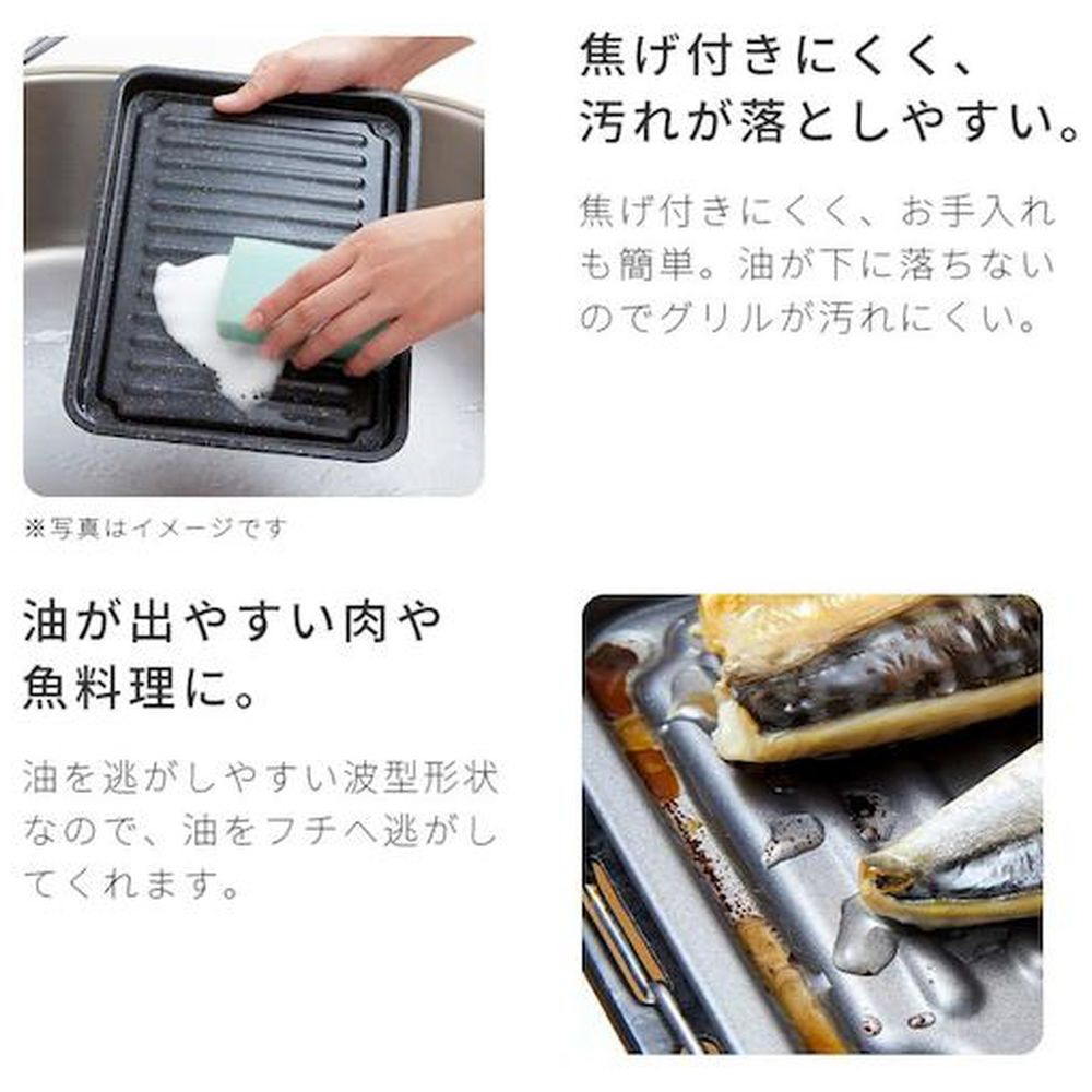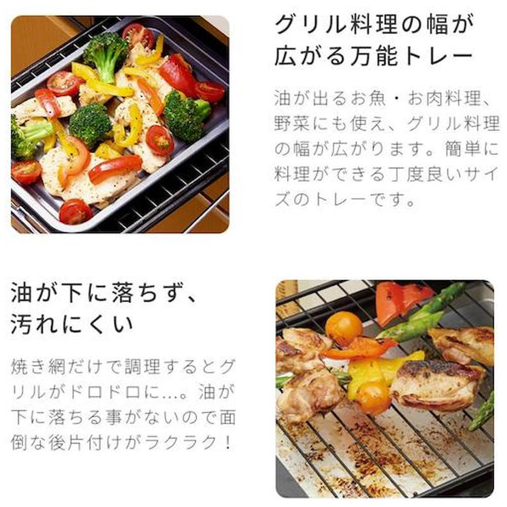 お手入れ簡単。ワイドサイズのグリルトレー。油が落ちにくく、こびりつきにくいので後片付けもラクラク。食材がカリッと美味しく焼き上がります。