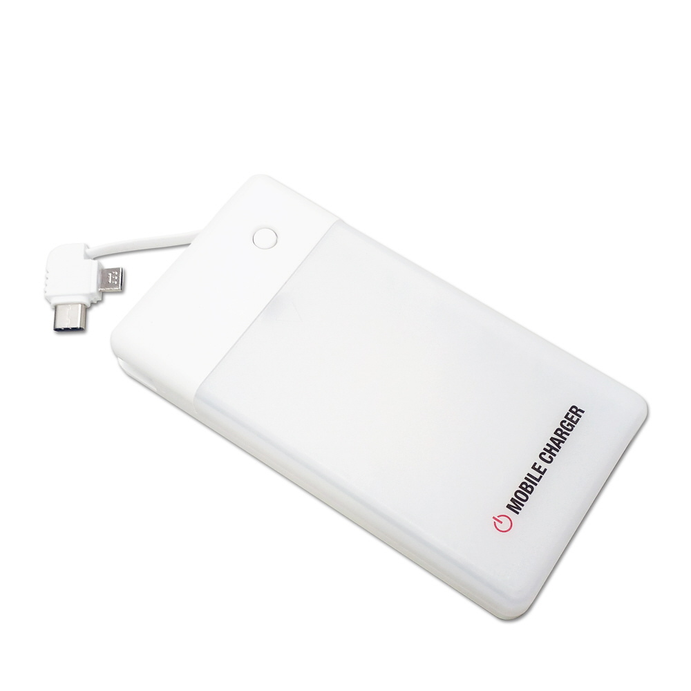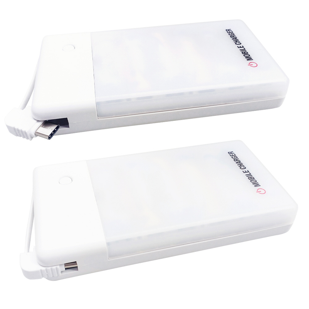 収納式マルチコネクタケーブル(microUSB+Type-C)搭載で様々なスマートフォン充電に対応。USBポート付きでiPhone等の充電もOK!(Lightningケーブル別売)停電などの緊急時に便利なLEDライト搭載。