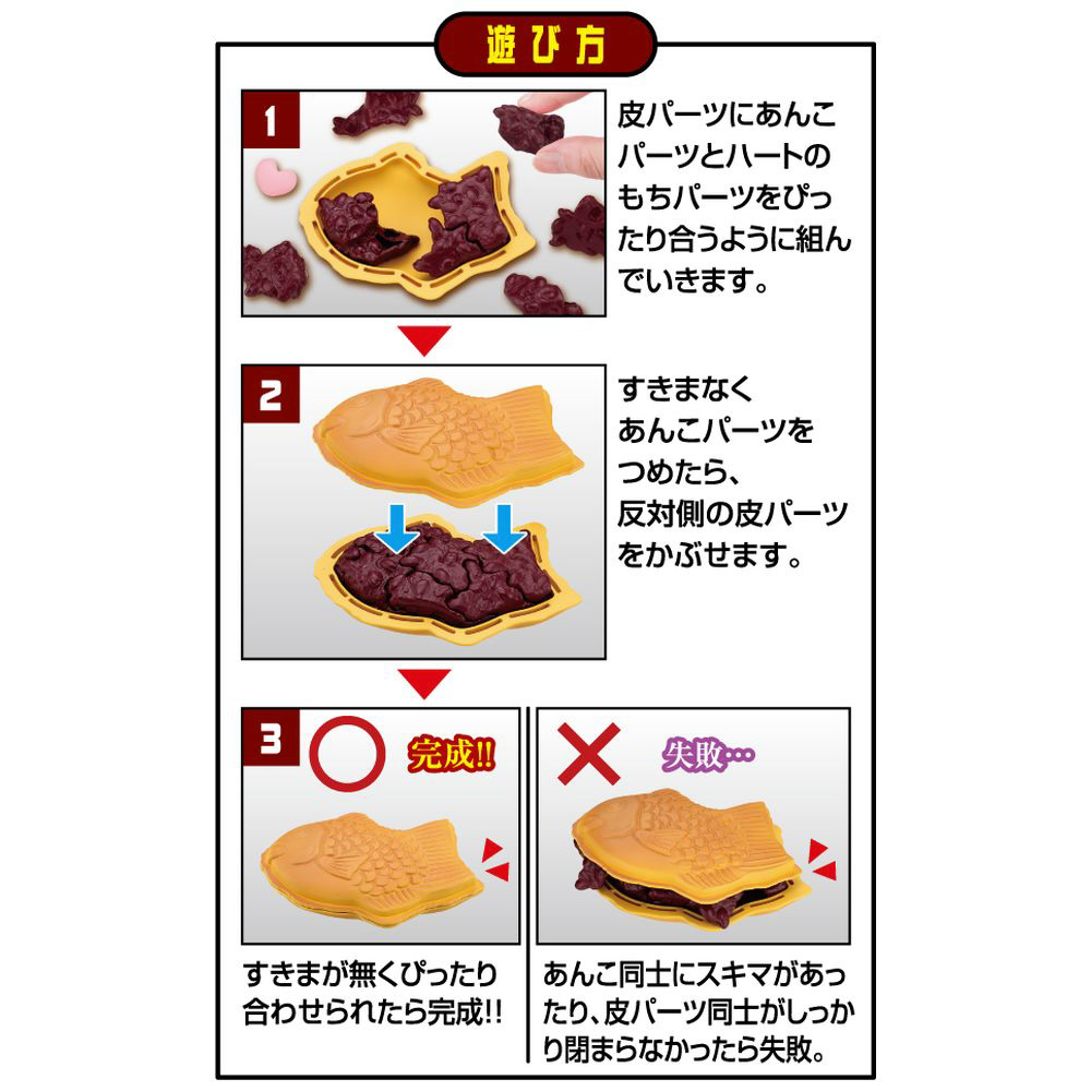 皮パーツの中に、あんこパーツを正しく組み合わせていれるとたい焼きが完成するパズルです。