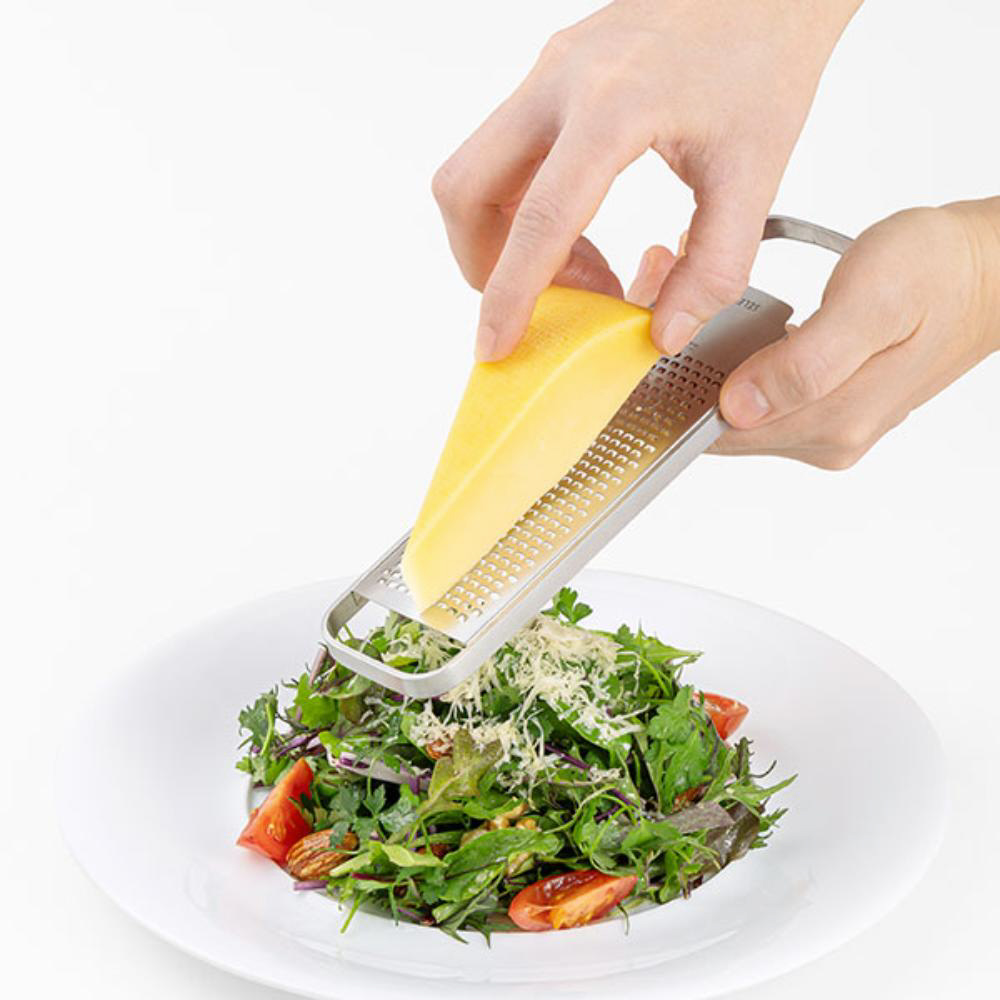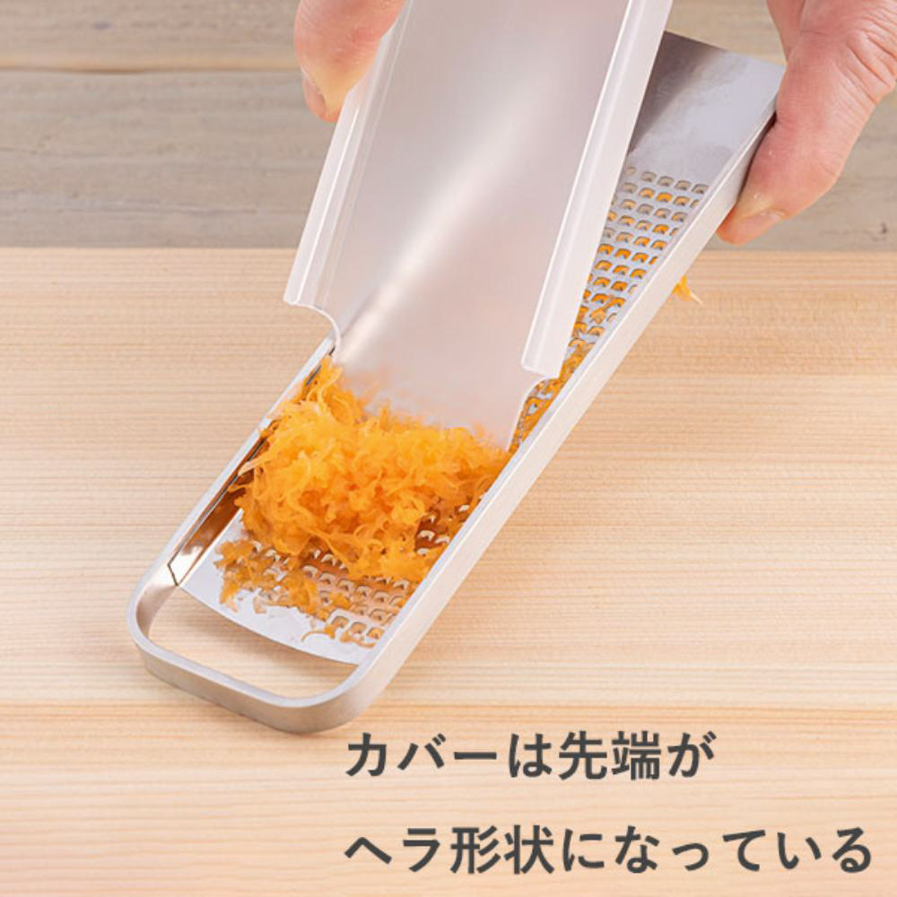 収納しやすいコンパクトな設計で引き出しポケットにも収まるサイズ感のグレーターです。ハードチーズや柑橘のほか、生姜、にんにくなど日常的に使う食材もおろせるグレーター。
