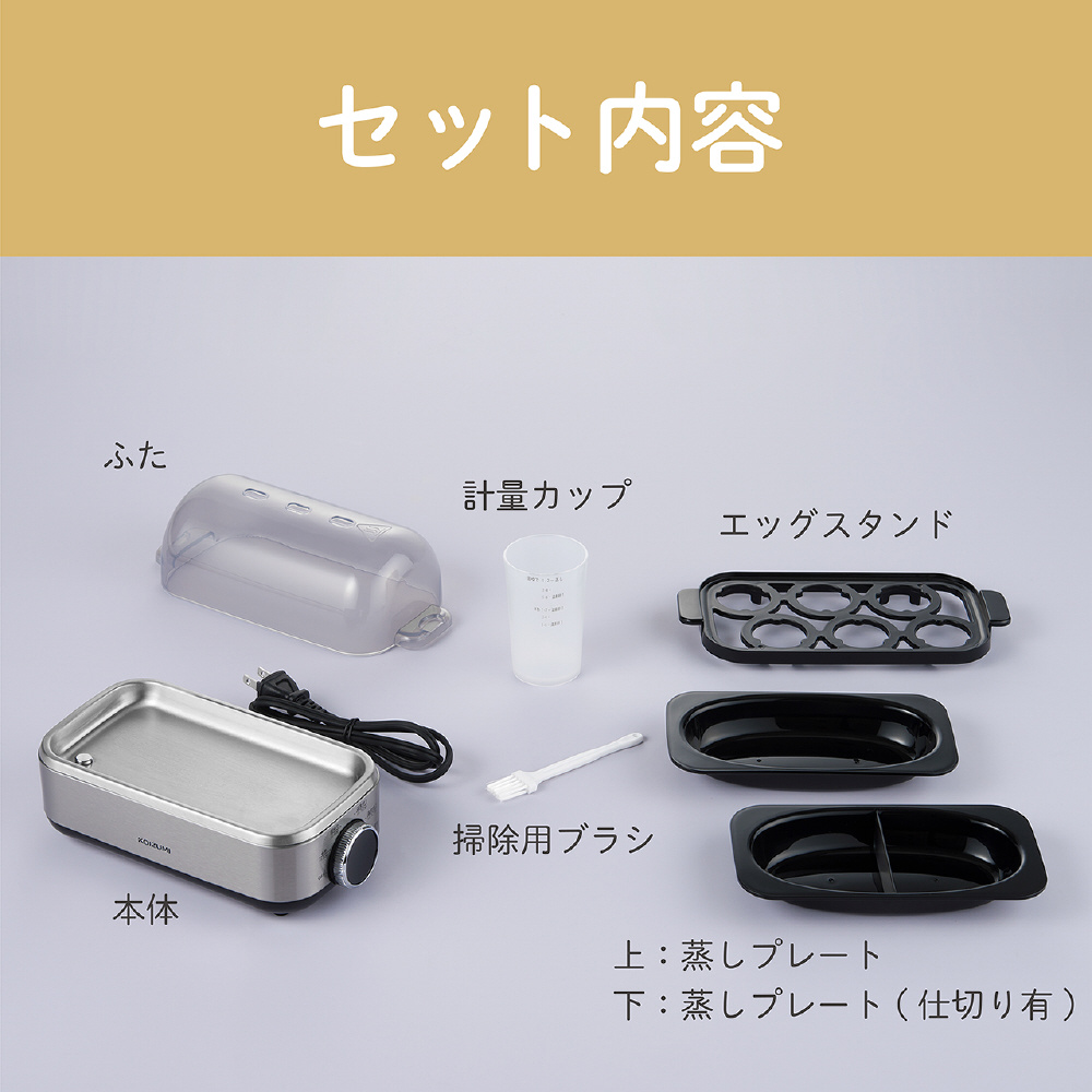 ・付属品:蒸し用プレート、蒸し用プレート(仕切り有)、計量カップ、掃除用ブラシ