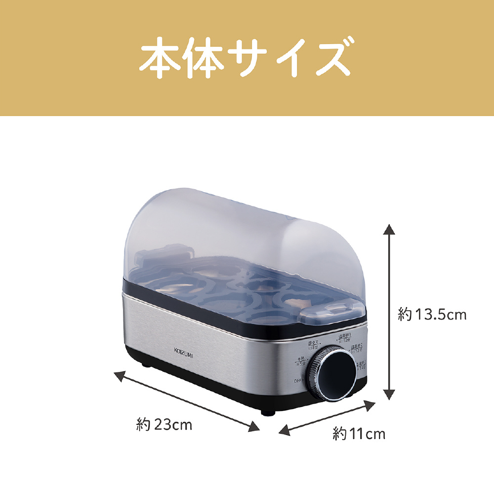 ゆでたまごは一度に6個調理可能、温泉卵は3個、たまごを置いて水を入れるだけで簡単調理。